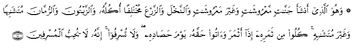 “Dan Dialah (Allah) yang menjadikan (untuk kamu) kebun-kebun yang menjalar tanamannya dan yang tidak menjalar, dan pohon-pohon tamar (kurma) dan tanaman-tanaman yang berlainan (bentuk, rupa dan) rasanya, dan buah zaiton dan delima, yang bersamaan (warnanya atau daunnya) dan tidak bersamaan (rasanya), makanlah dari buahnya ketika ia berbuah, dan keluarkanlah haknya (zakatnya) pada hari memetik atau menuainya, dan janganlah kamu melampau (pada apa-apa jua yang kamu makan atau belanjakan), Sesungguhnya Allah tidak suka kepada orang-orang yang melampau.”