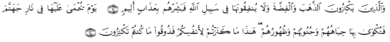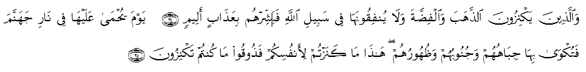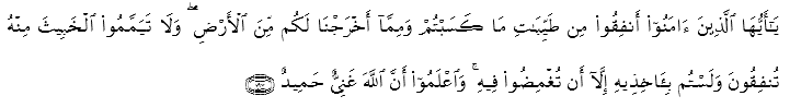 “Wahai orang-orang yang beriman! belanjakanlah (pada jalan Allah) sebahagian dari hasil usaha kamu yang baik-baik, dan sebahagian dari apa yang Kami keluarkan dari bumi untuk kamu, dan janganlah kamu sengaja memilih yang buruk daripadanya (lalu kamu dermakan atau kamu jadikan pemberian zakat), padahal kamu sendiri tidak sekali-kali akan mengambil yang buruk itu (kalau diberikan kepada kamu), kecuali dengan memejamkan mata padanya, dan ketahuilah, sesungguhnya Allah Maha Kaya, lagi sentiasa Terpuji.”